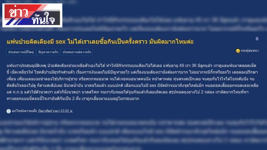ในโลกออนไลน์เกิดการถกเถียงอย่างกว้างขวางเกี่ยวกับปัญหาชีวิตคู่ หลังจากสตรีท่านหนึ่งได้โพสต์ขอคำปรึกษาบนเว็บไซต์ Pantip.com เธอเล่าถึงสถานการณ์ที่ยากลำบากในชีวิตสมรส โดยสามีของเธอซึ่งอายุ 49 ปี ประสบอุบัติเหตุจนกลายเป็นผู้ป่วยติดเตียง ไม่สามารถช่วยเหลือตัวเองได้ ในขณะที่เธอเองอายุ 36 ปี และยังมีความต้องการทางเพศตามปกติ